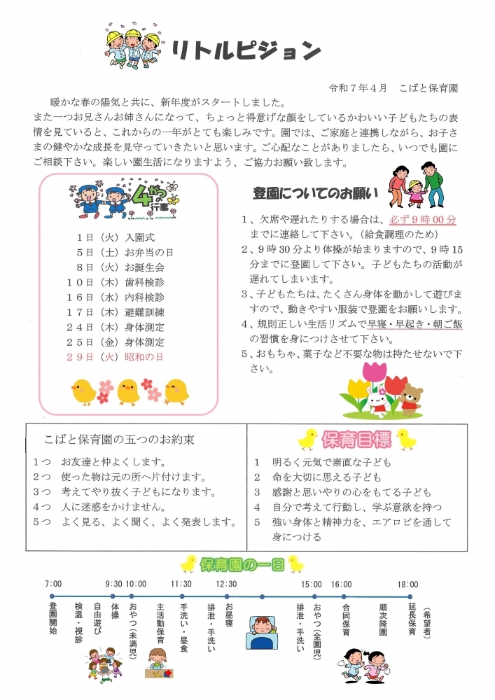 入園・進級から一ヶ月が過ぎ、緊張がほぐれた様子で、保育園の生活が楽しめるようになりました。自分のマークを覚え、靴やカバンの片付けなど、何でも自分でしようと意欲満々に、頑張っています。トイレトレーニングを始め、色々なことにチャレンジしていきたいと思います。
