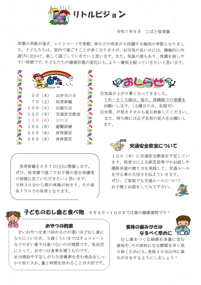 0歳児は、ハイハイや伝い歩き、歩行が日に日に上手になってきています。1歳児は、保育者の言葉をオウム返しで言ったり、動作を真似する姿が見られます。これから梅雨に入り、室内で過ごすことが多くなりますが、室内での遊びを工夫し安全面に気をつけて過ごしていきたいと思います。