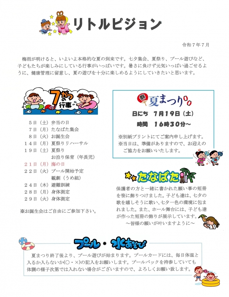 暑い日が続いていますので、熱中症や夏風邪等にかからないように、ご家庭の方でも健康面には、十分注意してあげて下さい。
