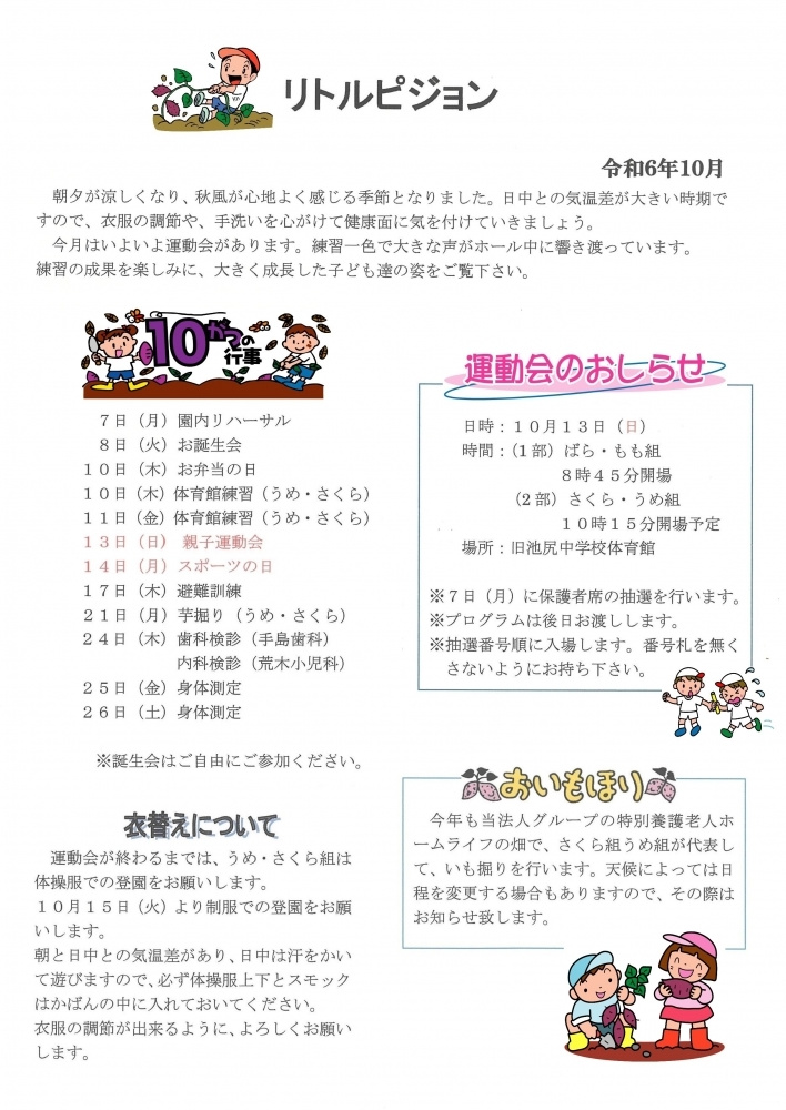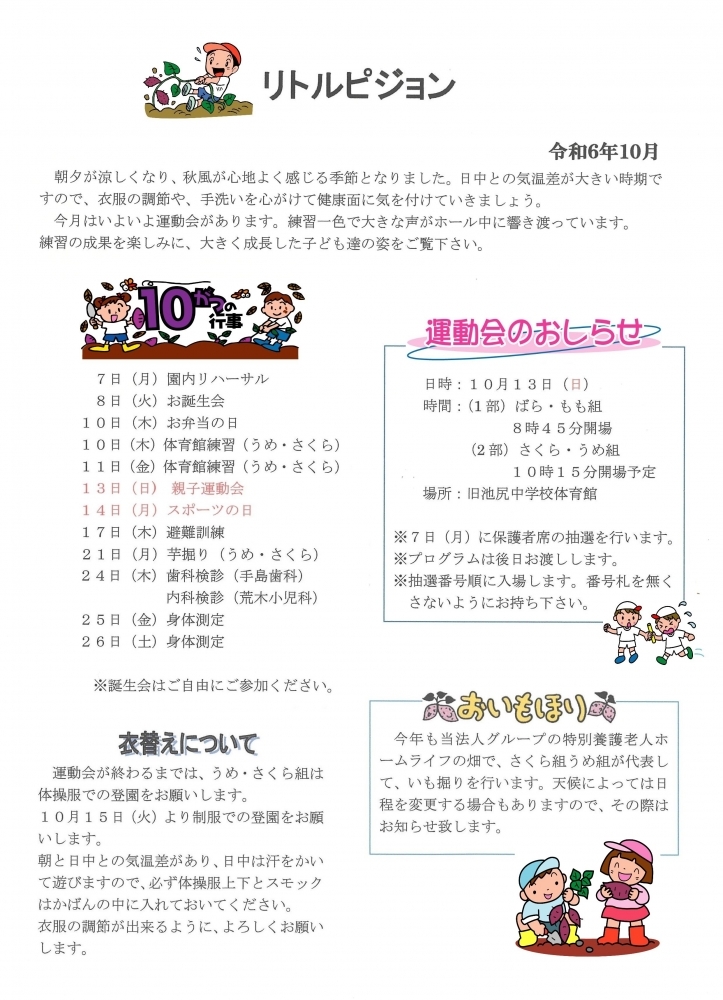 子どもたちは、運動会という大きな行事を経験して、色々な面で成長が感じられます。また、色々な物に興味や関心を持つようになり、友だちと関わって遊ぶことを喜ぶようになってきました。体力面では、長い距離を歩けるようになり、長めの散歩をしたり、戸外で思い切り遊んだりして、秋の自然が身近に感じられるようにしたいと思います。