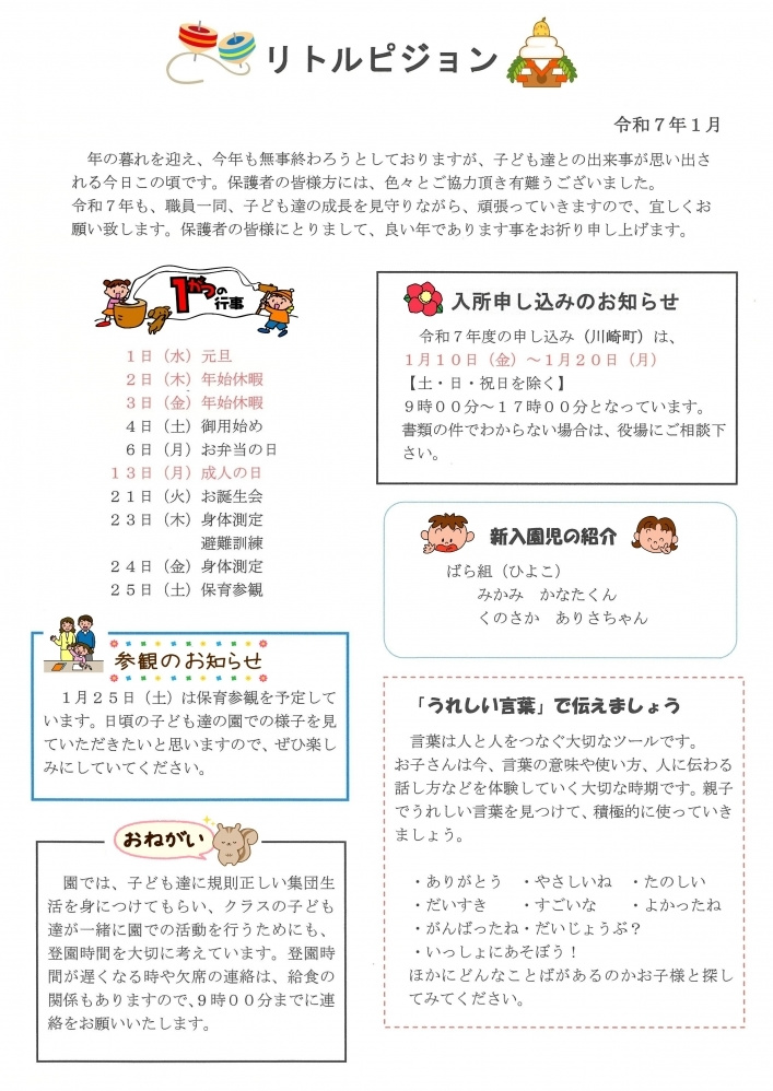 生活発表会では、日頃の元気を十分に発揮した子どもたち。緊張してしまい動きが固まってしまった子もいましたが、可愛い衣装姿で子ども達なりに頑張りを披露することが出来ました。年が明けるといよいよ3歳児クラスの進級が近づいてきます。進級に向けて、新しい生活を安心して送れるように、少しずつ準備をしていきたいと思います。