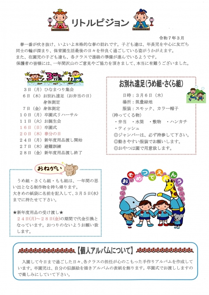 さくら組での生活も残りわずかとなりました。子ども達の中で”もうすぐうめ組!”という進級への期待が日増しに高まってきていて、行動や表情がとてもしっかりしてきたように感じます。子どもたちが自信や期待を持って進級を意識できるように、導いていきたいと思います。